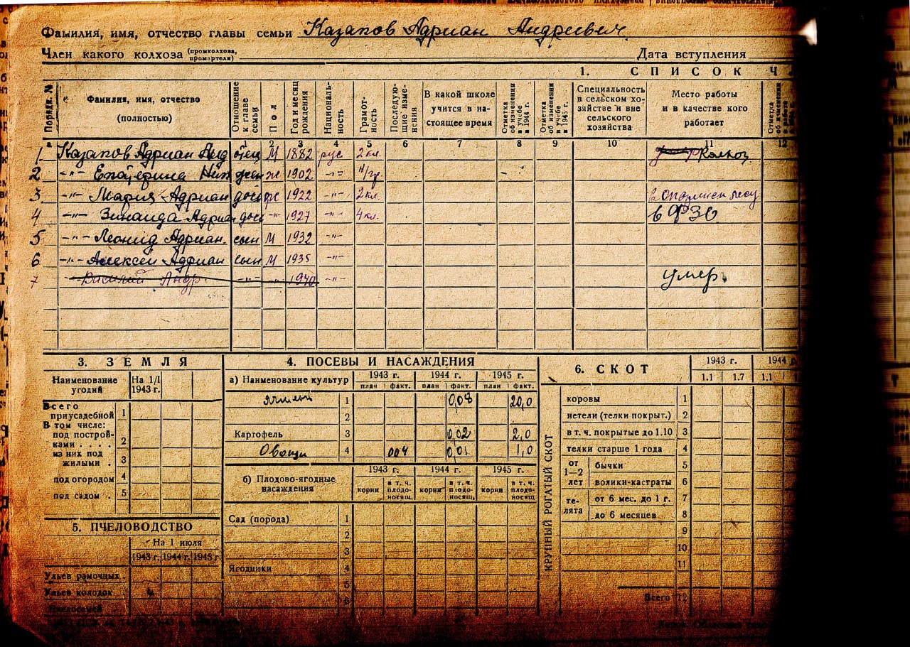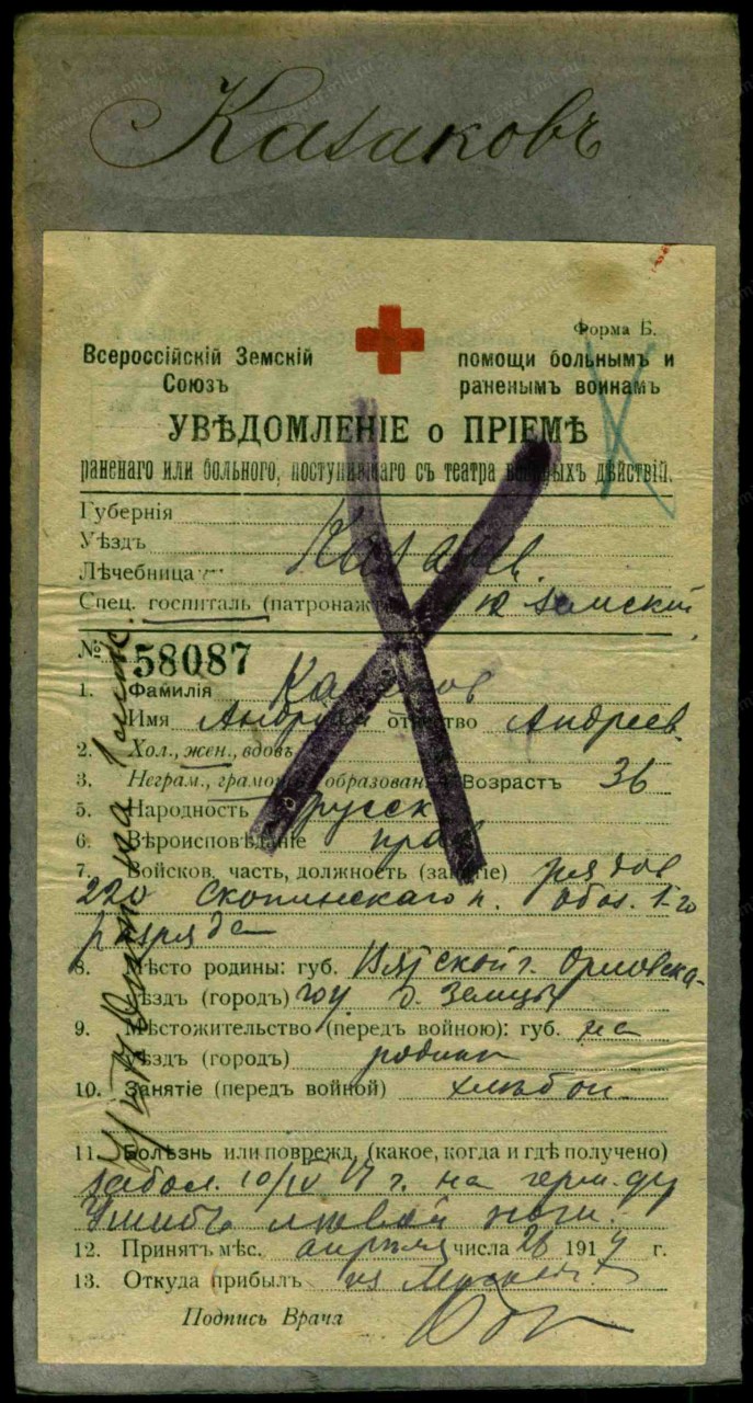 | участие в Первой мировой войне | 1914 - 1918 | Воинская часть 220-й пехотный Скопинский полк Должность/Звание рядовой Причина выбытия болен Дата события 28.04.1917 Тип документа Уведомление о приеме раненого Архив Российский Государственный Военно-исторический архив Фонд Картотека бюро учета потерь в Первой мировой войне (офицеров и солдат) Шкаф без номера Ящик 2848-П |