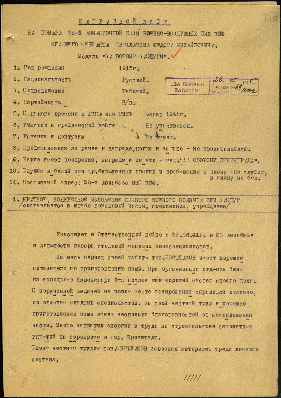 | Награждён: Медаль "За оборону Ленинграда" | Июль 1943 | Источники информации: 1. Сайт "Память народа" https://pamyat-naroda.ru 2. Приказ подразделения от: __.07.1943. Издан: авбз 23 ВВС БФ (архив: ЦВМА: Ф.88, Оп.2, Д.661). | |