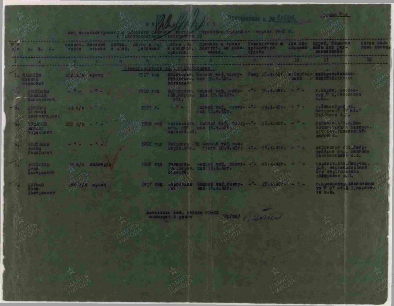 | Погиб | 18.04.1942 | город Слободской (Слободской район, Кировская область) - существующий н.п. |