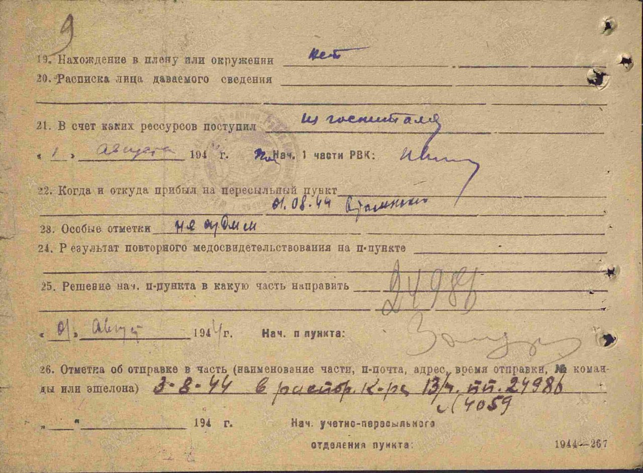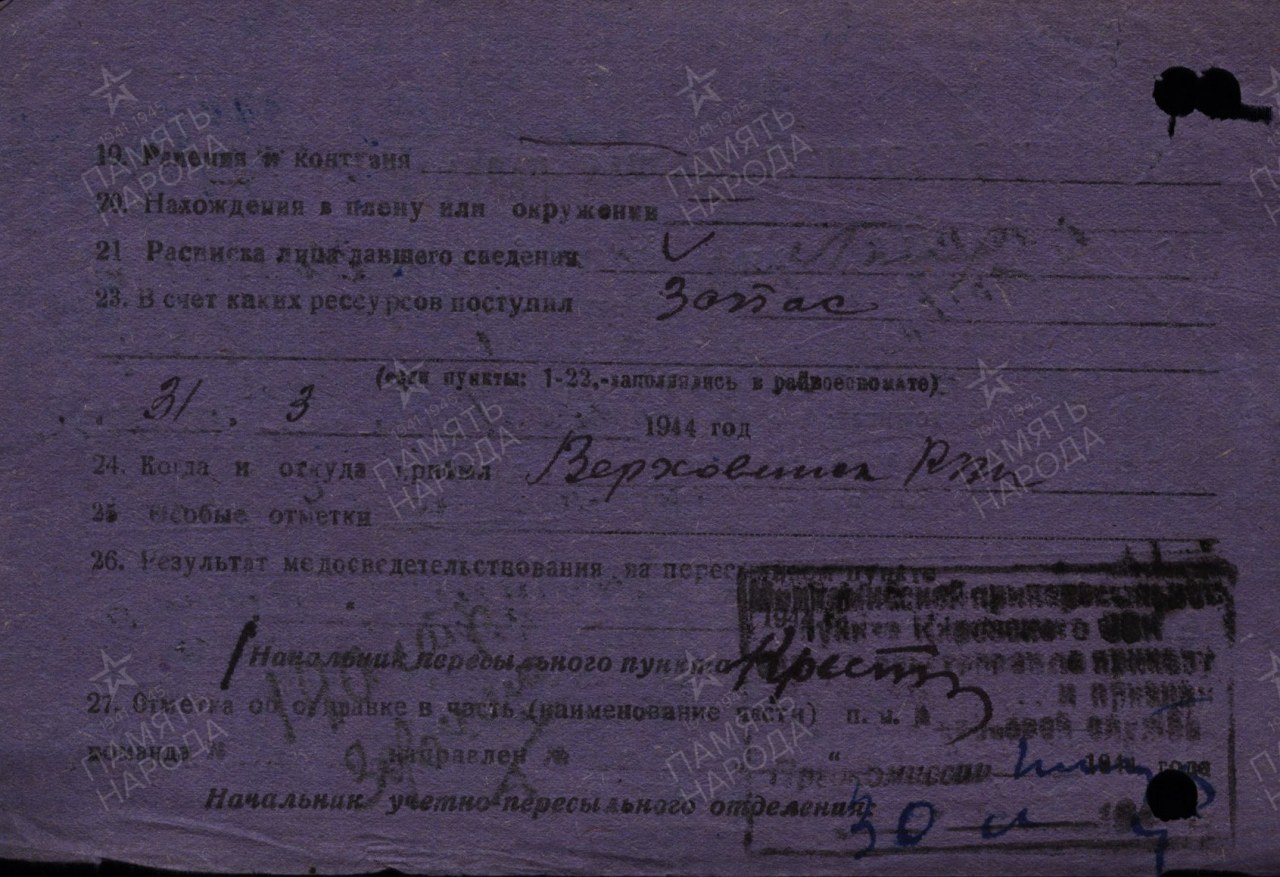 Выбытие из воинской части: 07.05.1944