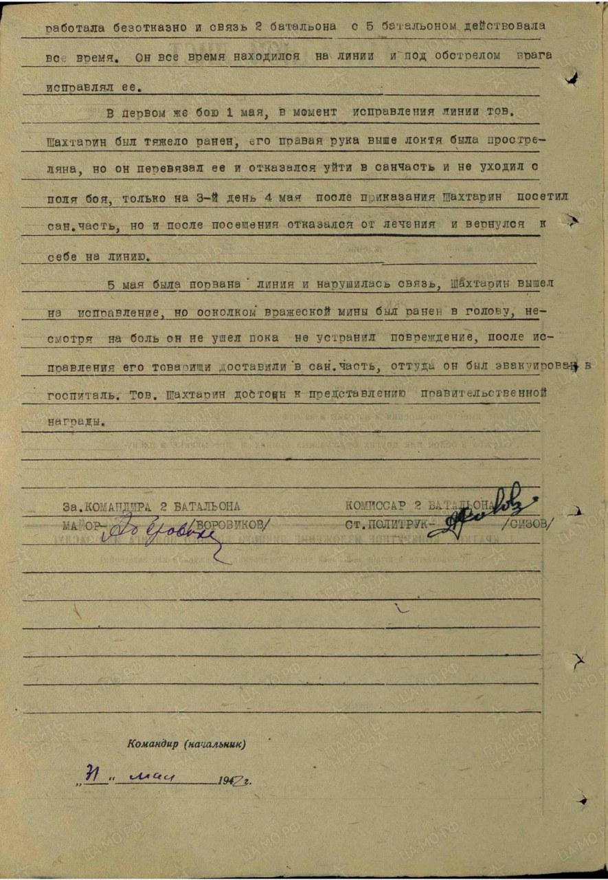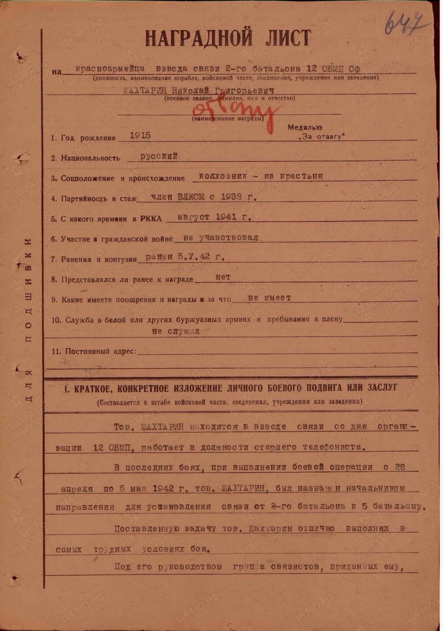 | Участие в ВОВ | - | Призван на фронт 15.08.1941 г. Котельническим РВК Кировской области Котельнического района. Служил красноармейцем, краснофлотцем взвода связи 2 батальона 12 бригады морской пехоты Северного Флота. Неоднократно ранен. (Архив Военно-морского флота 13496-2с-9) | |