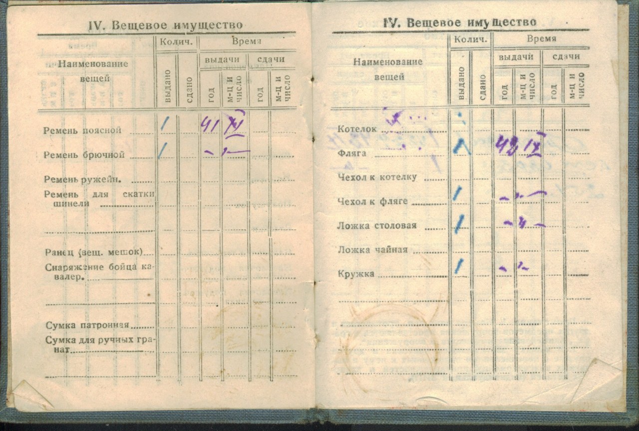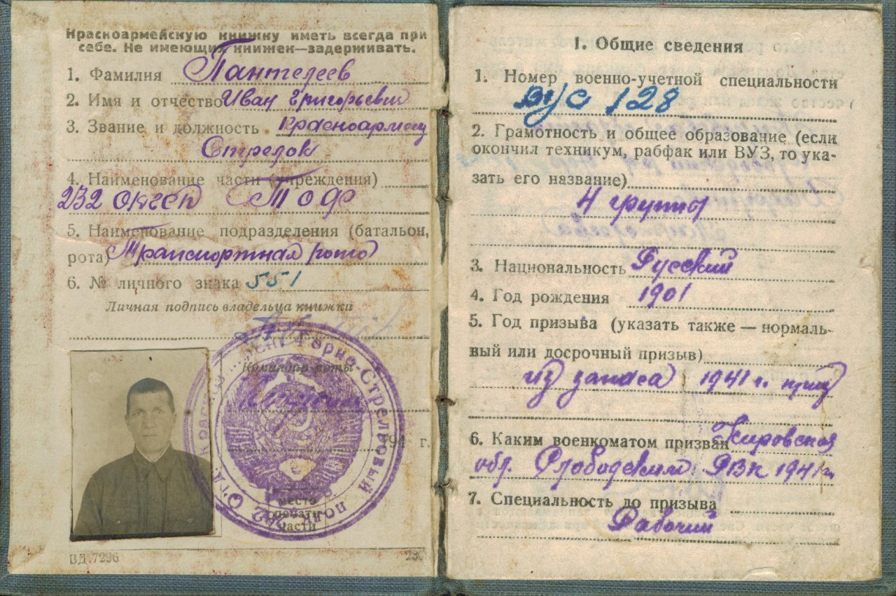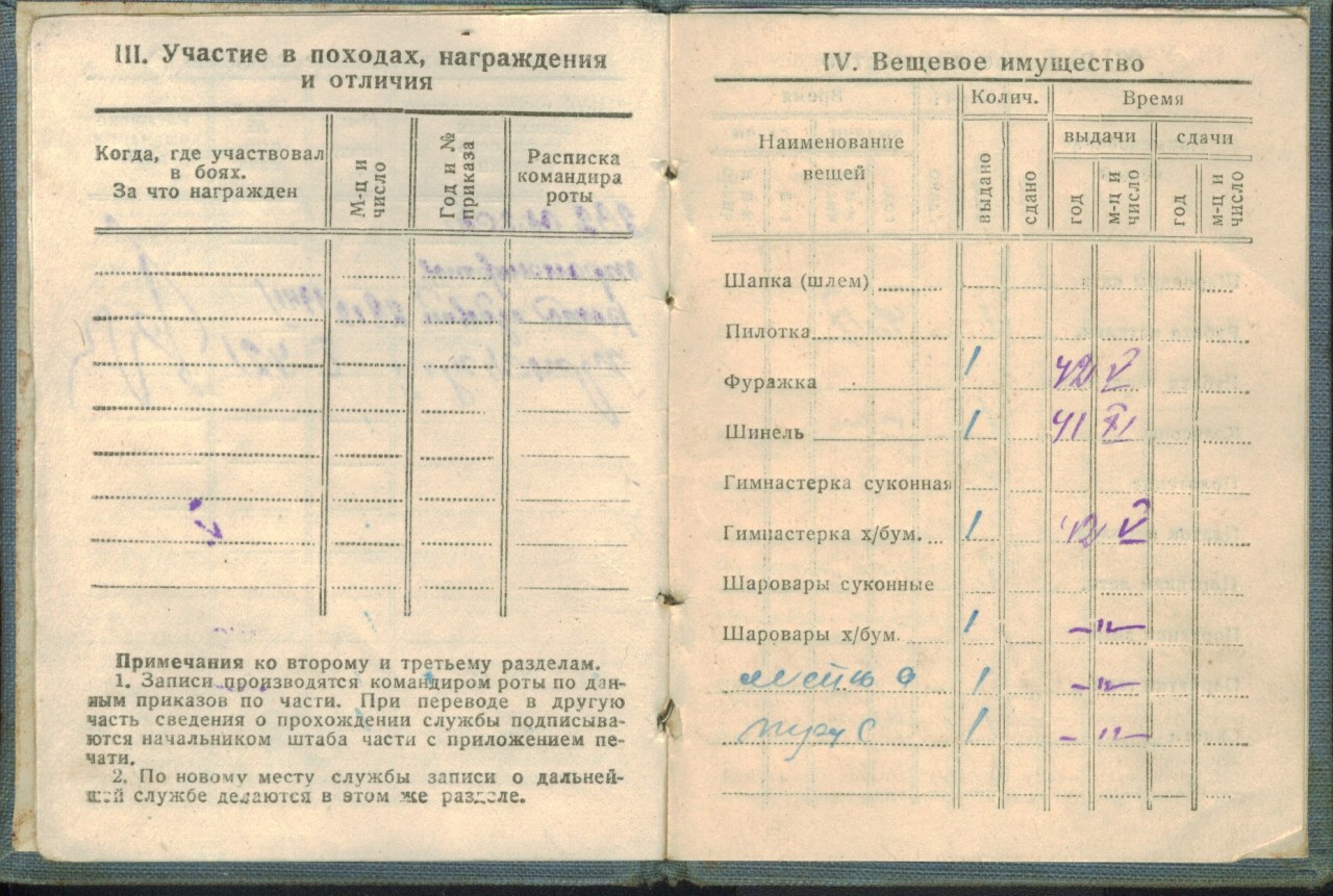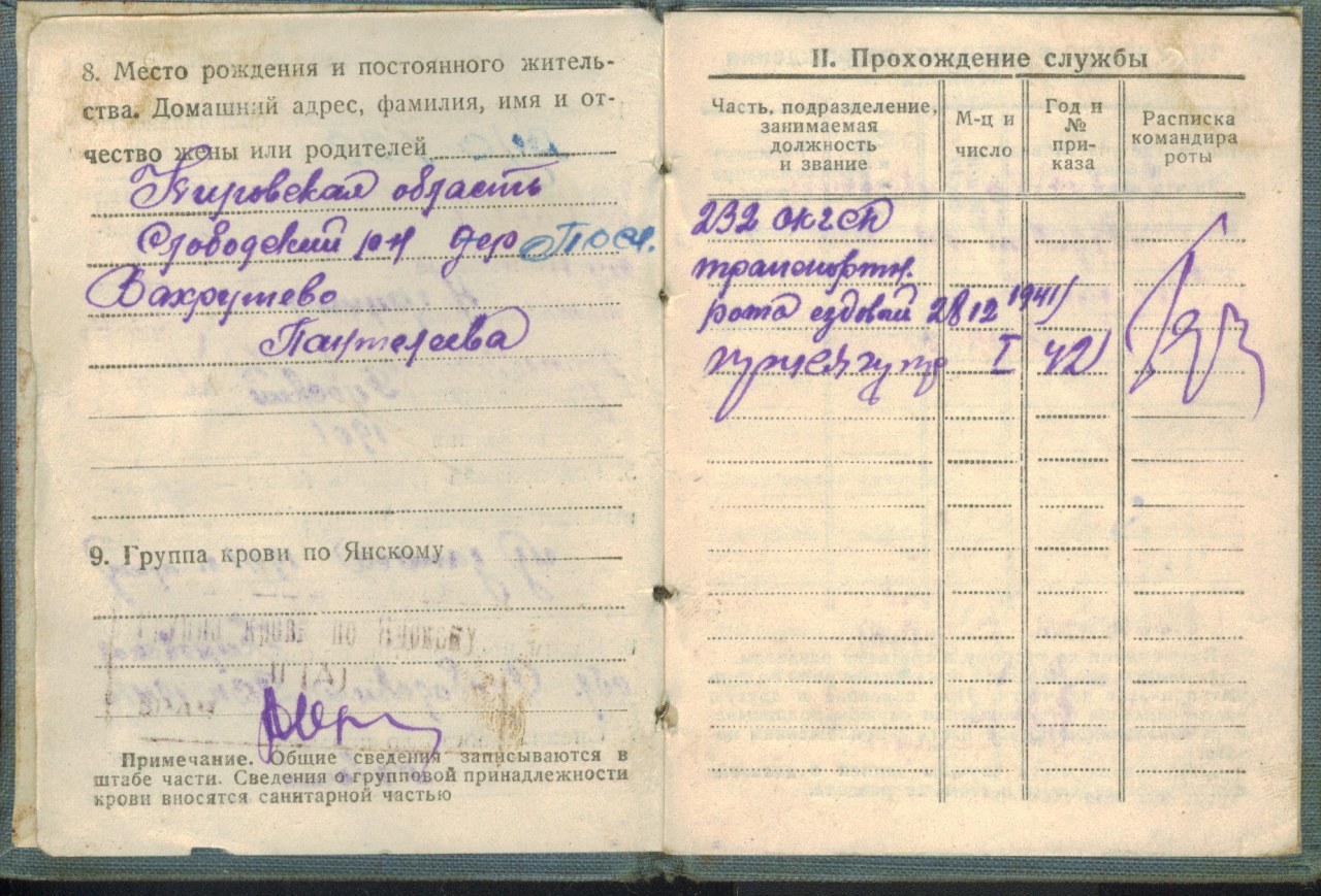 Воинский учет до войны: служил в РККА 4 г 6 месяцев с 00.00.1920 г по 00.00.1924 г, боцман морского флота, принят 16.09.1938 г, 23.10.1938 г, 02.09.1940 г ВУС Вахрушевский п/с.