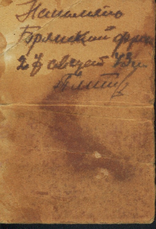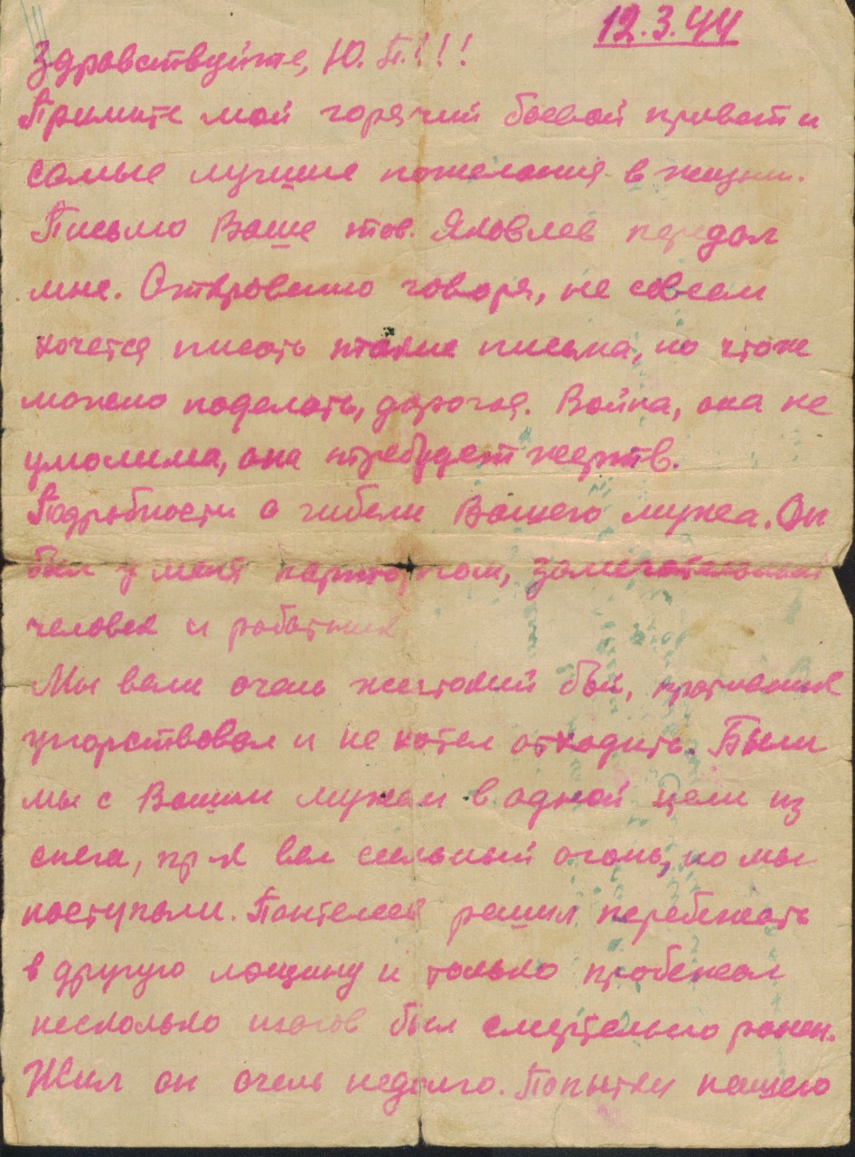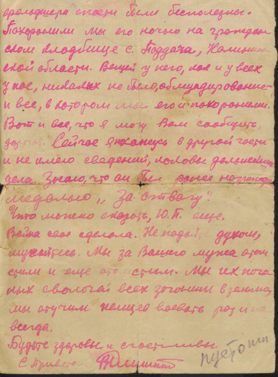 Родственники: жена Юлия Петровна, п. Вахруши Кокоревка ул. Ленина д. 17 а, д. 6 Слободской район, паспорт выдан Ленинградским ЛГМ, был сильно контужен, товарищи пишут, что погиб, письмо от сослуживцев было 23.03.1943 г