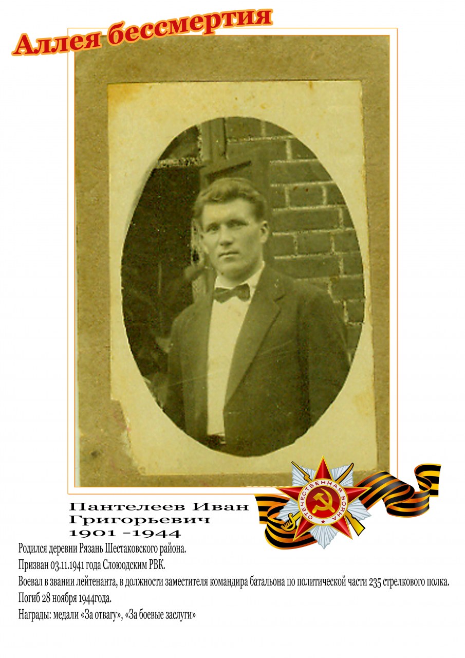 | 4310520006 | ПАНТЕЛЕЕВ Иван Григорьевич | 1901 г. р., с. Рязань Шестаковского р-на. Призван Слободским РВК в 1941 г. Лейтенант, зам. ком. бат-на по политчасти 235 сп. Погиб 28.11.1944 г. Место захоронения неизвестно. | Кировская область, Слободской район |