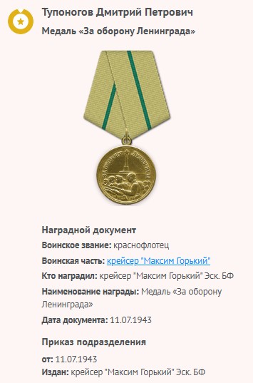 | Награждён: Медаль "За оборону Ленинграда" | 11.07.1943 | Наградной документ Воинское звание: краснофлотец Воинская часть: крейсер "Максим Горький" Кто наградил: крейсер "Максим Горький" Эск. БФ Наименование награды: Медаль «За оборону Ленинграда» Дата документа: 11.07.1943 Приказ подразделения от: 11.07.1943 Издан: крейсер "Максим Горький" Эск. БФ Информация об архиве - Архив: ЦВМА Фонд ист. информации: 88 Опись ист. информации: 2 Дело ист. информации: 663 | |