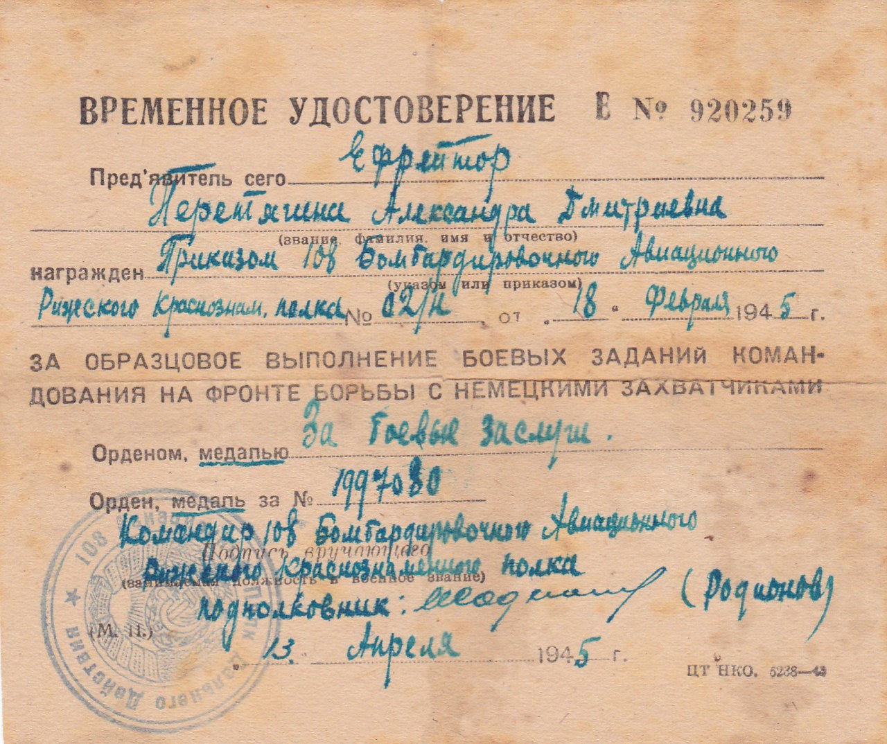 Описание заслуг: оснастила боевым вооружением 89 самолетов без срывов и отказов в период боевых действий, в каптерке все взрыватели, патроны и пиротехника содержатся в порядке, безупречное ведение документации.