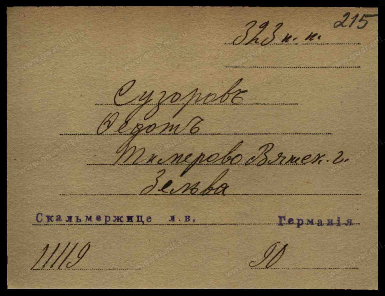 | Первая мировая война | 1914 - 1918 | Должность/Звание рядовой Воинская часть 323-й пехотный Юрьевецкий полк Место рождения Вятская губ., Орловский уезд, Верховская вол. Причина выбытия пропал без вести Дата события 29.08.1915 Тип документа Именные списки потерь Архив Российский Государственный Военно-исторический архив Фонд №16196, Особое делопроизводство по сбору и регистрации сведений о выбывших за смертью или за ранами, а также пропавших без вести воинских чинах, действующих против неприятельских армий (1914 - 1918) Опись №1, Именные списки потерь солдат и офицеров 1 мировой войны 1914-1918 гг. (по полкам и бригадам) Дело №523, Именные списки потерь солдат 323 пехотного Юрьевецкого полка Документ №258823, Именной список потерь нижних чинов 323 пехотного Юрьевецкого полка с 28 по 31 августа 1915 г., Автор: 323-й пехотный Юрьевецкий полк, 1915-10-07 | |