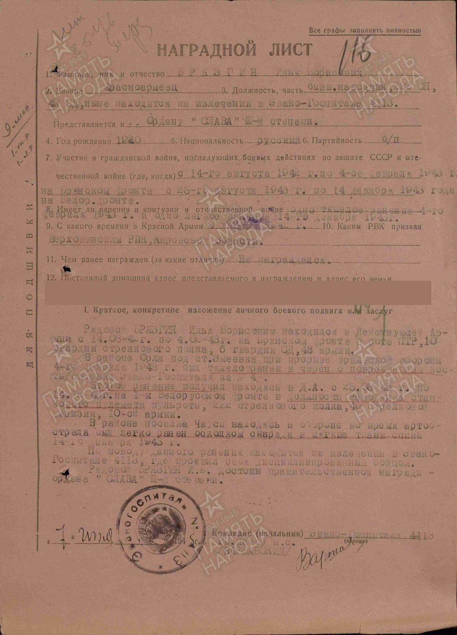 Дата и место призыва: 24.01.1942 Верховинский РВК, Кировская обл., Верховинский р-н (Брызгин Илья Гаврилович)