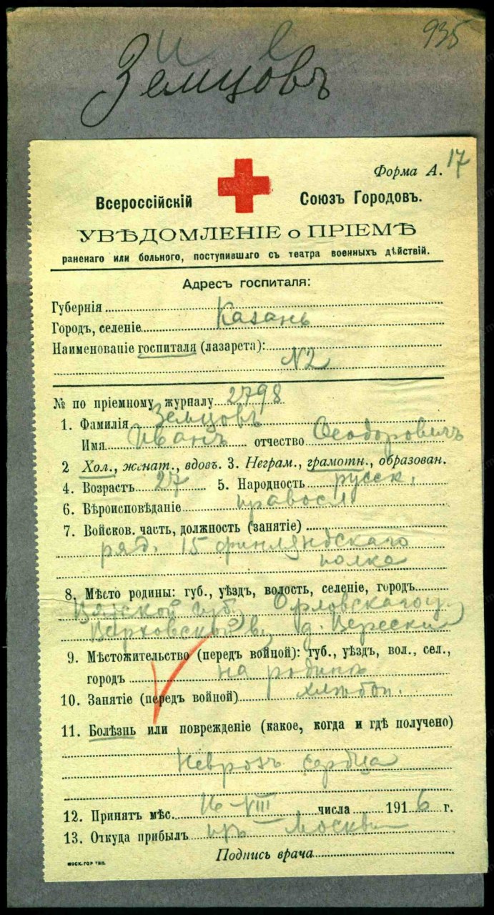 | первая мировая война | 1914 - 1918 | Должность/Звание рядовой Воинская часть 15-й Финляндский стрелковый полк Место рождения Вятская губ., Орловский уезд, Верховская вол., поч. Верески Причина выбытия болен Дата события 16.08.1916 Тип документа Уведомление о приеме раненого Архив Российский Государственный Военно-исторический архив Фонд Картотека бюро учета потерь в Первой мировой войне (офицеров и солдат) Шкаф без номера Ящик 1206-З |