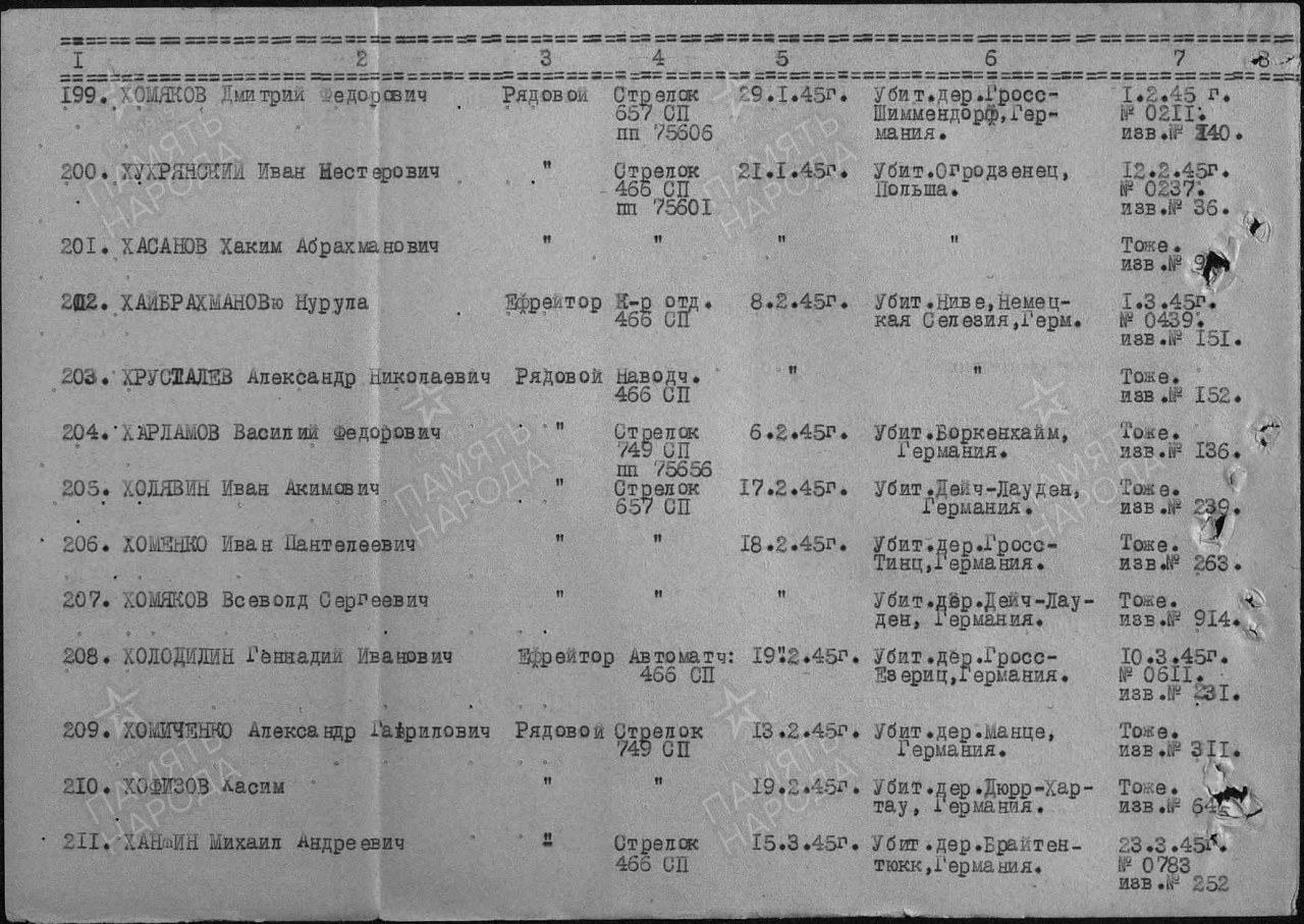 | 4308467004 | ХАЛЯВИН Иван Акимович | 1911 г. р., д. Халевенки Шабарденского с/с, красноармеец, стрелок, 657 сп, 1256 сд, 17.02.1945 г. погиб в бою. Захоронен в Германии, Бреслаульский у., д. Дейглауден. | Кировская область, Оричевский район |