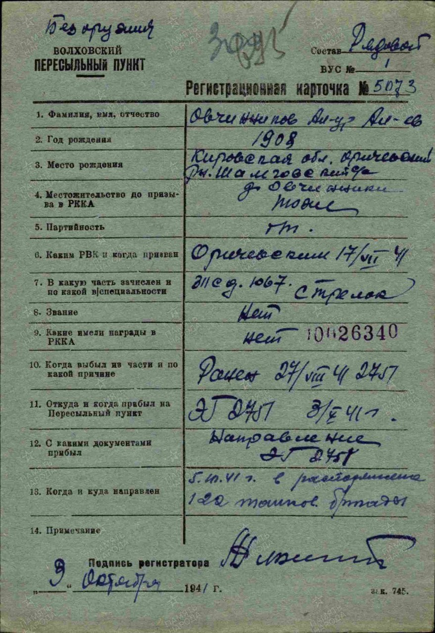 Овчинников Александр Алексеевич, 1908 г.р., из д. Овчинники Шалеговского с/с Оричевского района. Мобилизован Оричевским РВК в 689 сп. Красноармеец, стрелок, 1067 сп 311 сд. Ранен 27.08.1941 г. Выбыл в часть 30.09.1941 г. из ЭГ 1751. Волховский пересыльный пункт до 05.10.1941 г. Выбыл в 122 тбр. Ранен. ЭГ 4017. Выбыл в часть 09.05.1942 г. 71 зсп 34 зсд. Кировский ВПП (до 22.12.1943 г.).