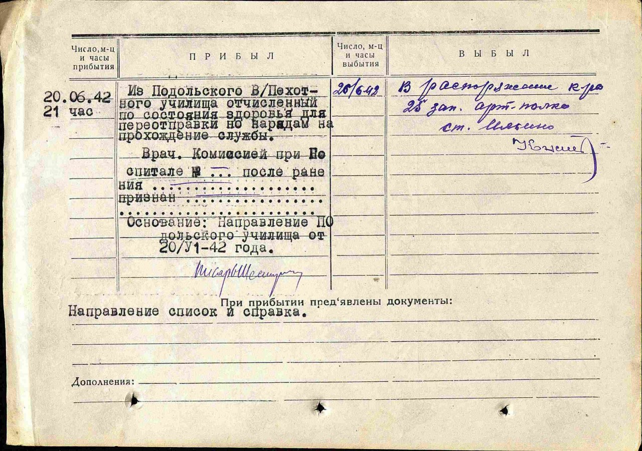 | Служба в армии | 10.11.1941 - 1943 (прибл.) | 86 стрелковая бригада | Призван Сталинским РВК гор. Кирова. Домашний адрес: г. Киров, ул. Октябрьская, д.7, кв.7. Воинское звание: рядовой. ВУС (военно-учетная специальность) № 10 (разведчик). Военно-пересыльный пункт: Ивановский военно-пересыльный пункт, Ивановская обл., г. Иваново Воинская часть: 86 сбр Выбытие из воинской части: 26.06.1942 Куда выбыл: 25 зап. ап Откуда прибыл: Подольское ВПУ, Московская обл., г. Подольск. Служил 2 года. Источники: 1. ЦА МО: Ф.Ивановский ВПП, Оп.226570, Д.13. 2. Сайт https://pamyat-naroda.ru |