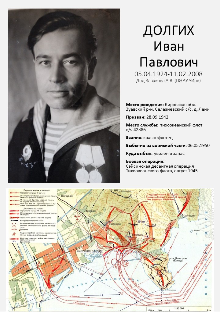 | участие в Великой Отечественной войне | 1942 - 09.05.1945 | Воинское звание краснофлотец Воинская часть 1 Балтийский ФЭ объедин. школа КБФ, г. Энгельс штаб ОВР КМОР Воинское звание: краснофлотец Воинская часть: 1 взв. учр 1 Балтийского ФЭ КБФ (в/ч 22966) Выбытие из воинской части: 25.05.1943 Куда выбыл: штаб ОВР КМОР Дата прибытия: 23.05.1943 Откуда прибыл: объедин. школа КБФ Воинское звание: ст. краснофлотец Воинская часть: катер "МО"-418 7 ДМО Либавская ВМБ ОМОР КБФ Воинское звание: краснофлотец Воинская часть: 59 орс , 68 отдельная рота связи | |