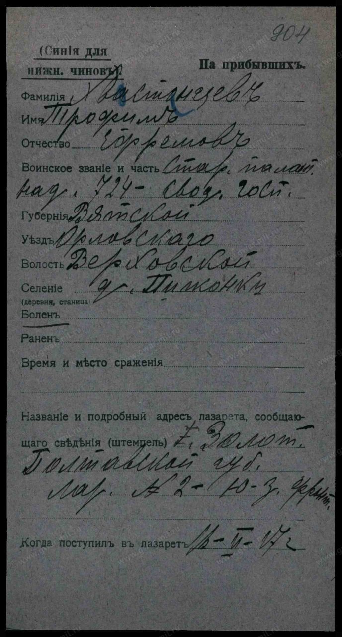 | Первая мировая война | 1914 - 1918 | Воинская часть 724-й сводный госпиталь Место рождения Вятская губ., Орловский уезд, Верховская вол., д. Пилконки Причина выбытия болен Дата события 16.02.1917 Тип документа Карточка на прибывших (нижние чины) Архив Российский Государственный Военно-исторический архив Фонд Картотека бюро учета потерь в Первой мировой войне (офицеров и солдат) Шкаф без номера Ящик 3690-Х | |