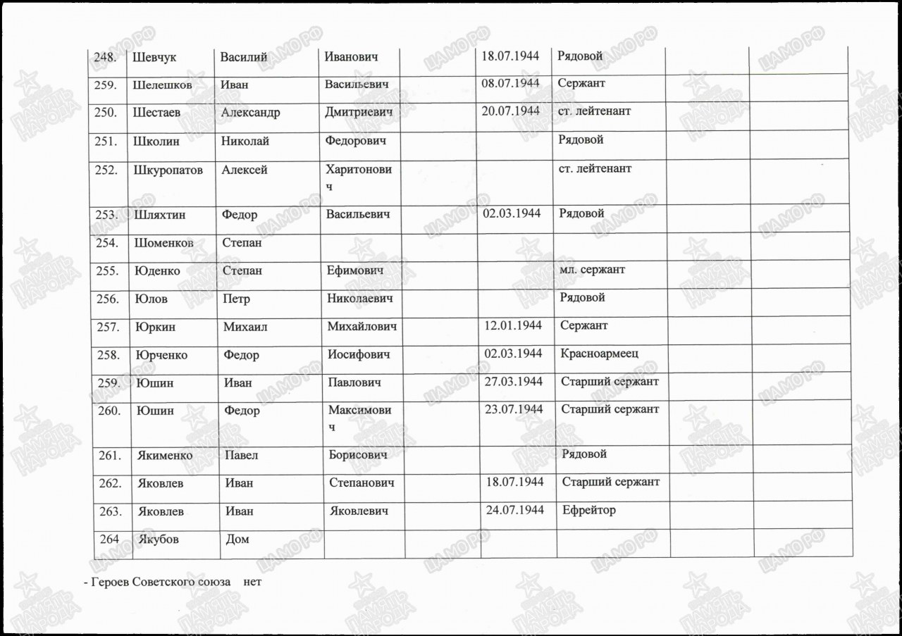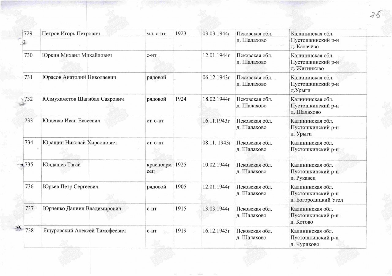 | 4307677015 | ЮРКИН Михаил Михайлович | 1910 г. р.,д. Кленовая Оричевского р-на. Призван Нолинским РВК, сержант, мл. командир, 538 омп, 536 ап. 12 января 1944 г, умер от ран в ОМСБ 244. Захоронен в лесу, в 1 км сев. д. Житняки Пустошкинского р-на Псковской обл., мог. 1. | Кировская область, Нолинский район |
