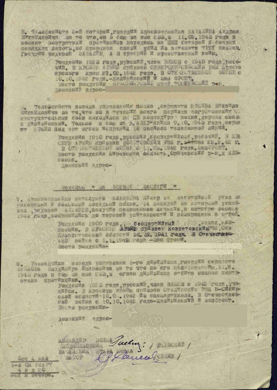 | Награждён: Медаль «За отвагу» | 05.11.1943 | Приказ № 9/н по 536 аминп РГК | |