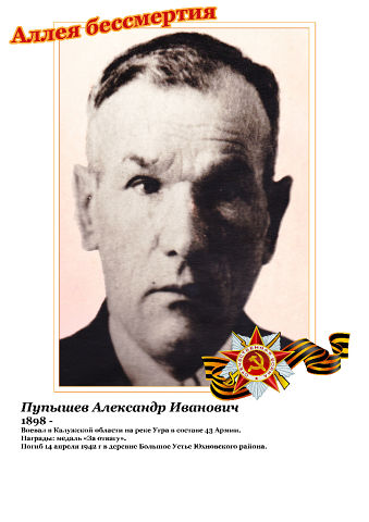 6. Пупышев Александр Иванович, 1898 года, уроженец с. Ленинское (Вахруши С.М.) красноармеец, убит 14.04.1942 г д. Б. Устье.