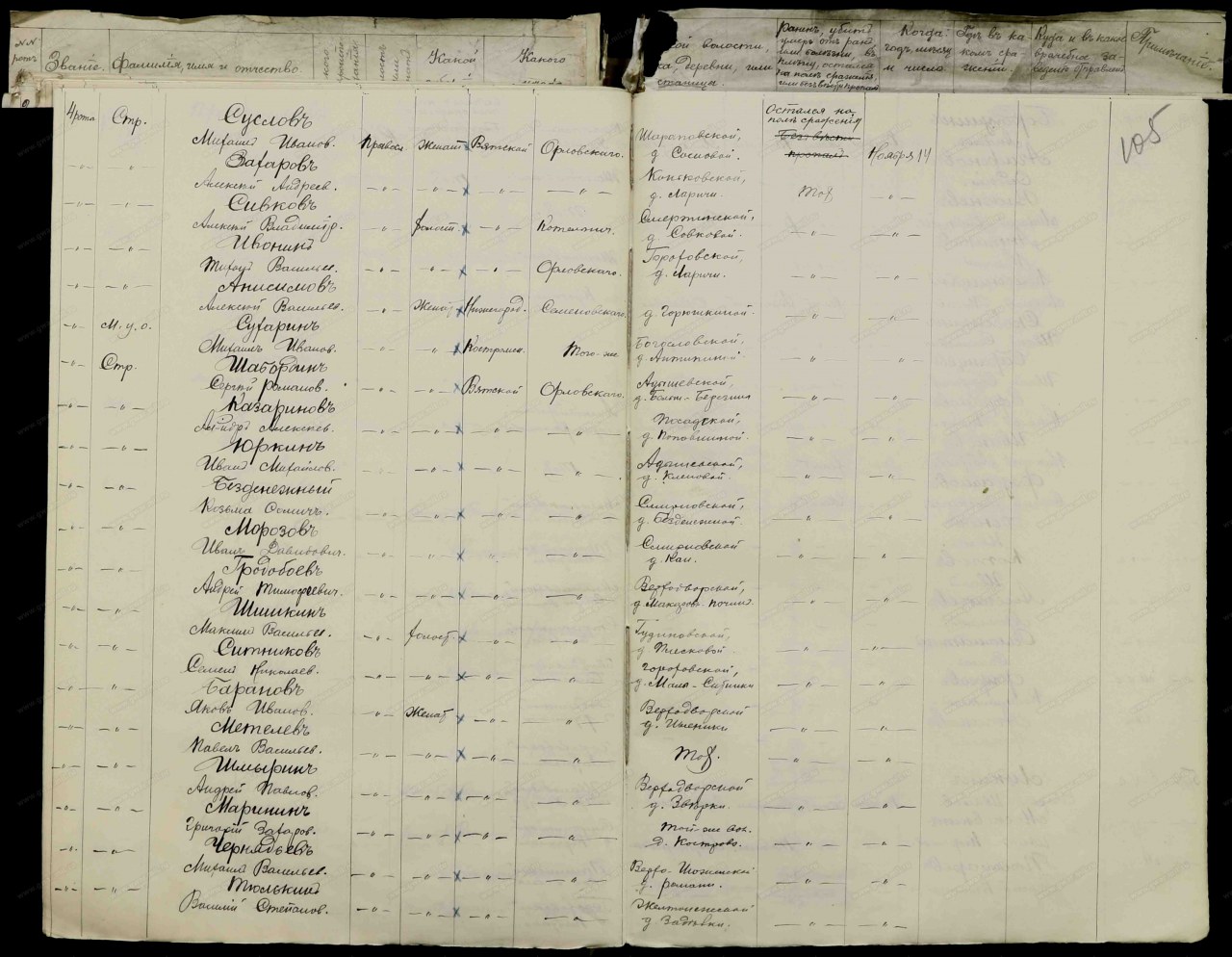 | Первая мировая война | 1914 - 1918 | Должность/Звание стрелок Воинская часть 50-й Сибирский стрелковый полк Место рождения Вятская губ., Орловский уезд, Гороховская вол., д. Мало-Ситинка Причина выбытия оставлен на поле боя Дата события 14.11.1914 Место события д. Скворода Архив Российский Государственный Военно-исторический архив Фонд №16196, Особое делопроизводство по сбору и регистрации сведений о выбывших за смертью или за ранами, а также пропавших без вести воинских чинах, действующих против неприятельских армий (1914 - 1918) Опись №1, Именные списки потерь солдат и офицеров 1 мировой войны 1914-1918 гг. (по полкам и бригадам) Дело №812, Списки потерь солдат 50 Сибирского стрелкового полка Документ №83488, Именной список потерь нижних чинов 50 Сибирского стрелкового полка с 5 по 23 ноября 1914 г., Автор: 50-й Сибирский стрелковый полк | |