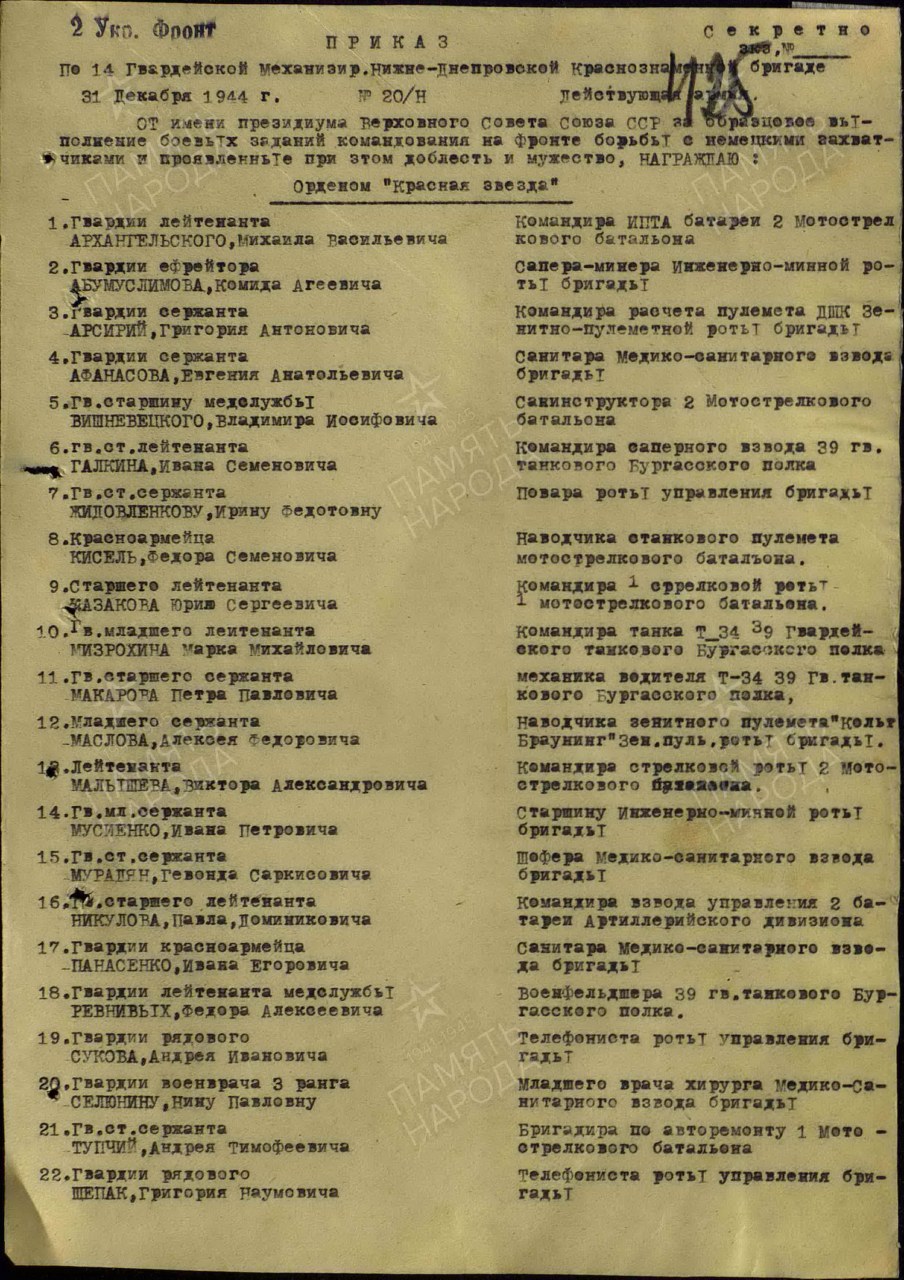 ... Врач Селюнина Н.П работает МСБ 14-ГМБ в должности мл. врача хирурга За время своей работы МСВ показала себя, как опытный, исключительно отзывчивый и внимательный смелый спокойный и решительный врачом. Никакая внешняя тактическая обстановка не мешает ей спасать жизнь раненого, стоя около него маске со скальпелем руках, ни просочившиеся автоматчики под Сарато- Фозем не прорвавшаяся группа Немцев до соседней улица Белграде ни сильный артилерийский обстрел гани Не одному десятку бойцов и офицеров спасла жизнь Селюнина Н.П. через ее руки в последних двух операциях прошло 200 раненых Несколько суток подряд она не отходила от операционного стола, превозмогая сон и усталость Высокую оценку хирургической работы она получила от от корпусного хирурга ...»