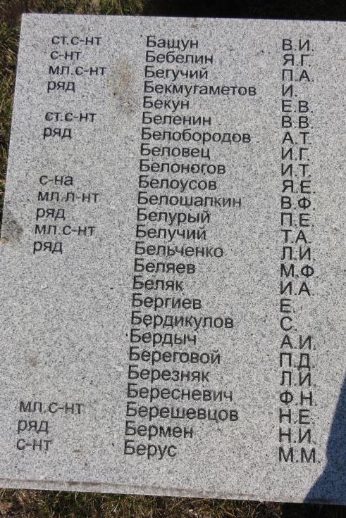 | 1802081024 | БЕЛОРУСОВ Яков Евстигнеевич | род. в ст. Областная. Призван в Сов. Армию. Старшина. Погиб в бою 20 янв. 1944. Похоронен в Кенигсбергской обл. | Удмуртская Республика, Игринский район | |||