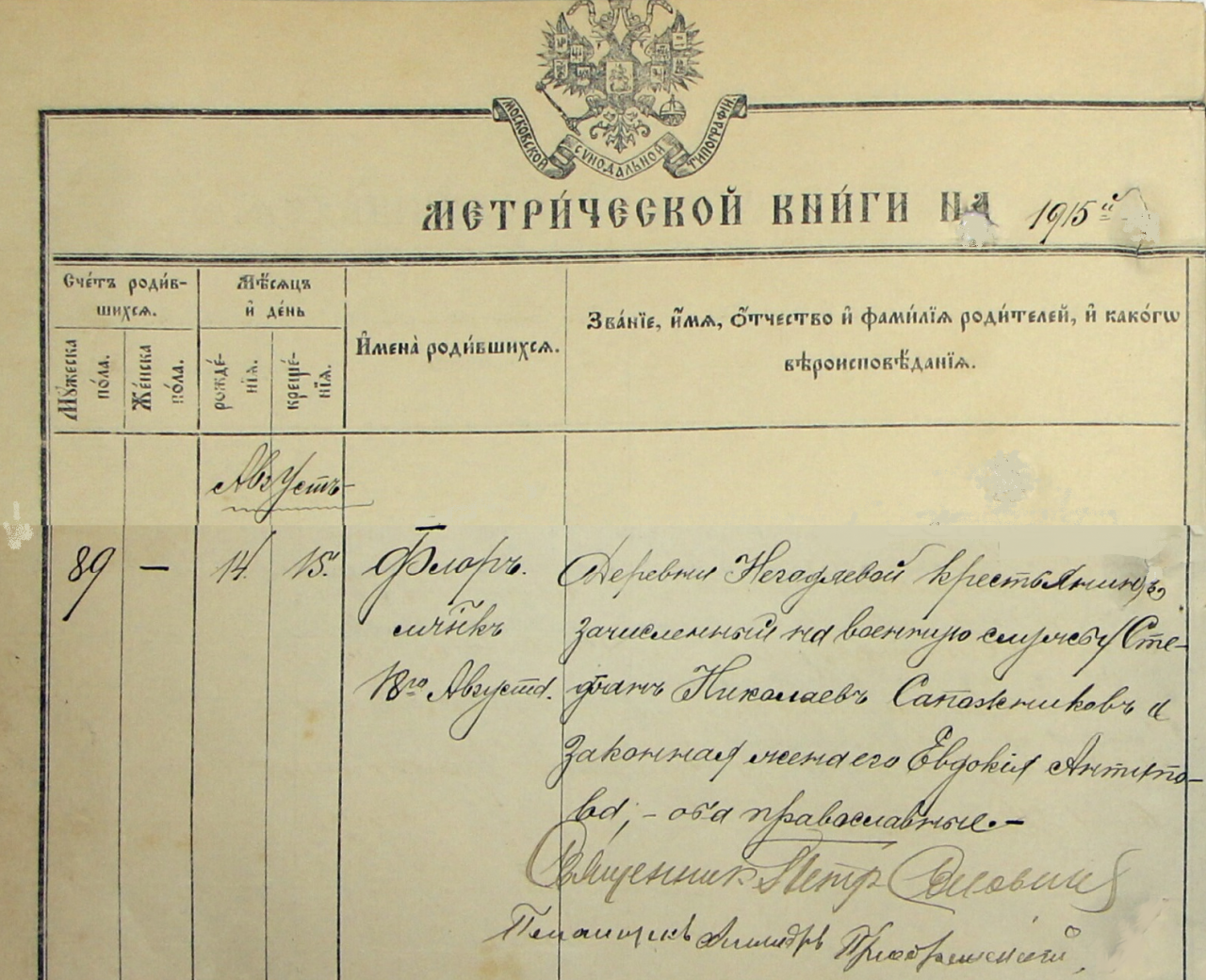 | Родился | 14.08.1915 юл/ст. | деревня Ключевая (Негодяева) (Медведевский район, Республика Марий Эл) - существующий н.п. | Запись из Метрической книги Троицкой церкви села Михайловского, Царевококшайского уезда о родителях: "Деревни Негодяевой крестьянин, зачисленный на военную службу Стефан Николаевич Сапожников и законная жена его Евдокия Антипова, оба православные". Рождён 14 августа 1915 года (по юлианскому календарю), крещён 15 августа. Имя дано в честь мученика Флора. |