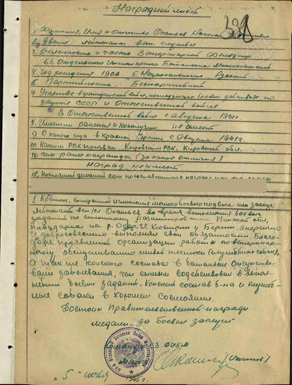 Лейтенант ветеринарной службы, ветфельдшер 63-го отдельного батальона собак миноискателей 1-го Белорусского фронта.