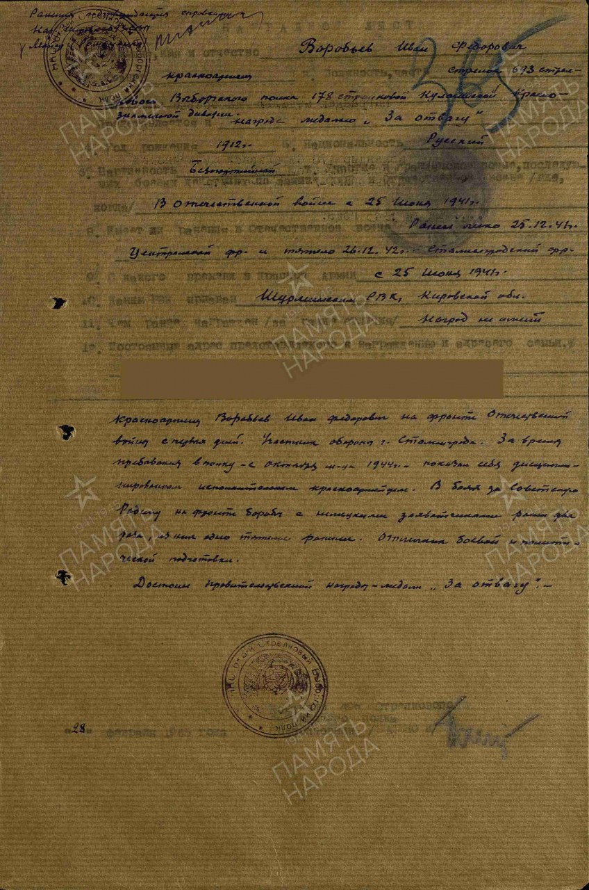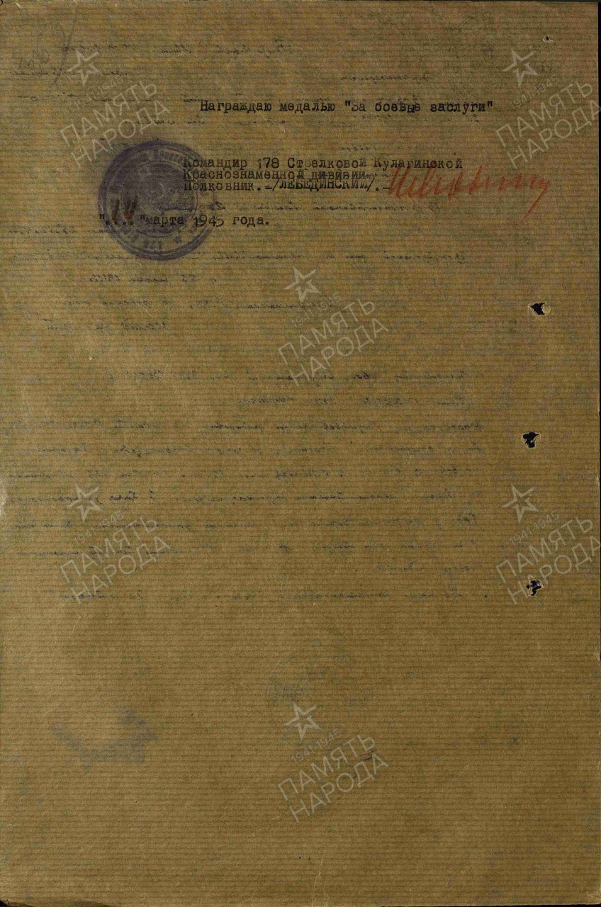 | Награждён: Медаль «За боевые заслуги» | 14.03.1945 | Воинское звание: рядовой Военно-пересыльный пункт: 178 сд Кто наградил: 178 стрелковая дивизия Наименование награды: Медаль «За боевые заслуги» Дата документа: 14.03.1945 Информация об архиве - Архив: ЦАМО Фонд ист. информации: Картотека награждений Дело ист. информации: шкаф 17, ящик 17 оинское звание: красноармеец Воинская часть: 693 сп Кто наградил: 178 КСД 23 А Наименование награды: Медаль «За боевые заслуги» Номер документа: 19/н Дата документа: 14.03.1945 Место призыва: Шурминский РВК, Кировская обл., Шурминский р-н Приказ подразделения №: 19/н от: 14.03.1945 Издан: 178 КСД 23 А Информация об архиве - Архив: ЦАМО Фонд ист. информации: 33 Опись ист. информации: 686196 Дело ист. информации: 4827 | |
