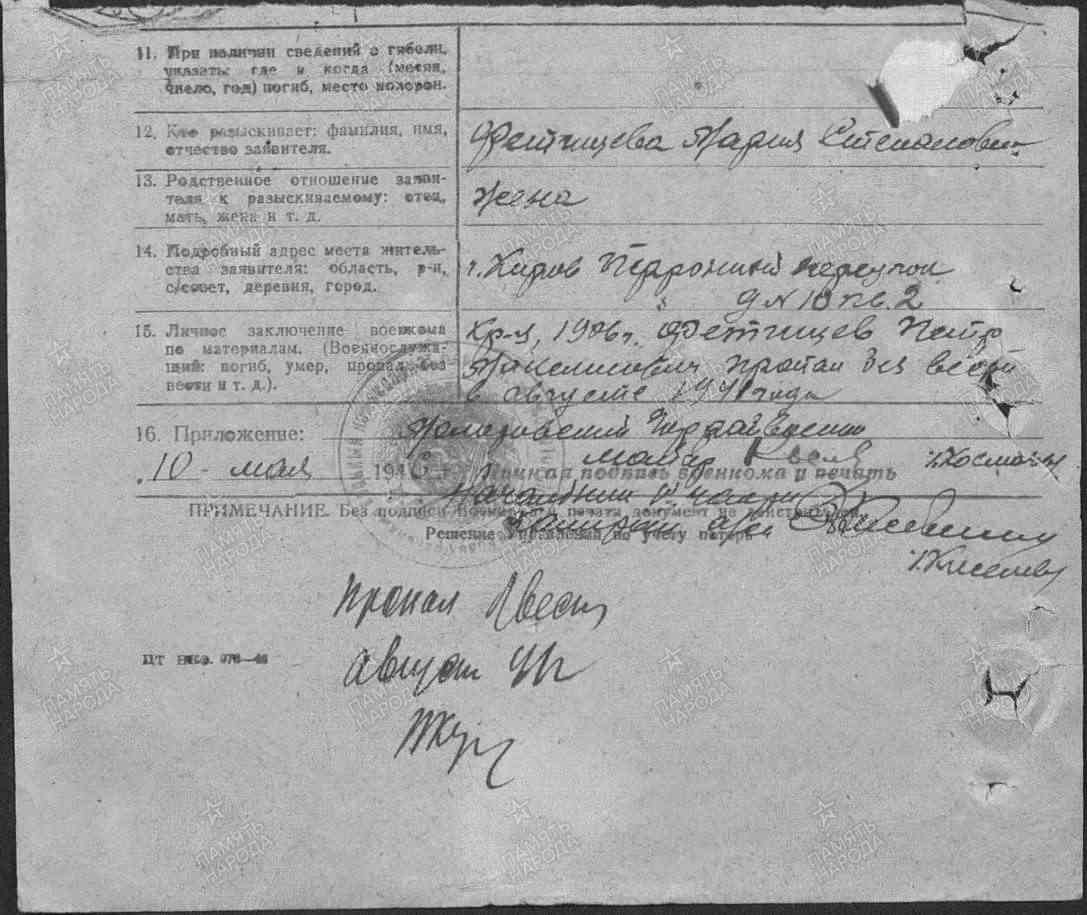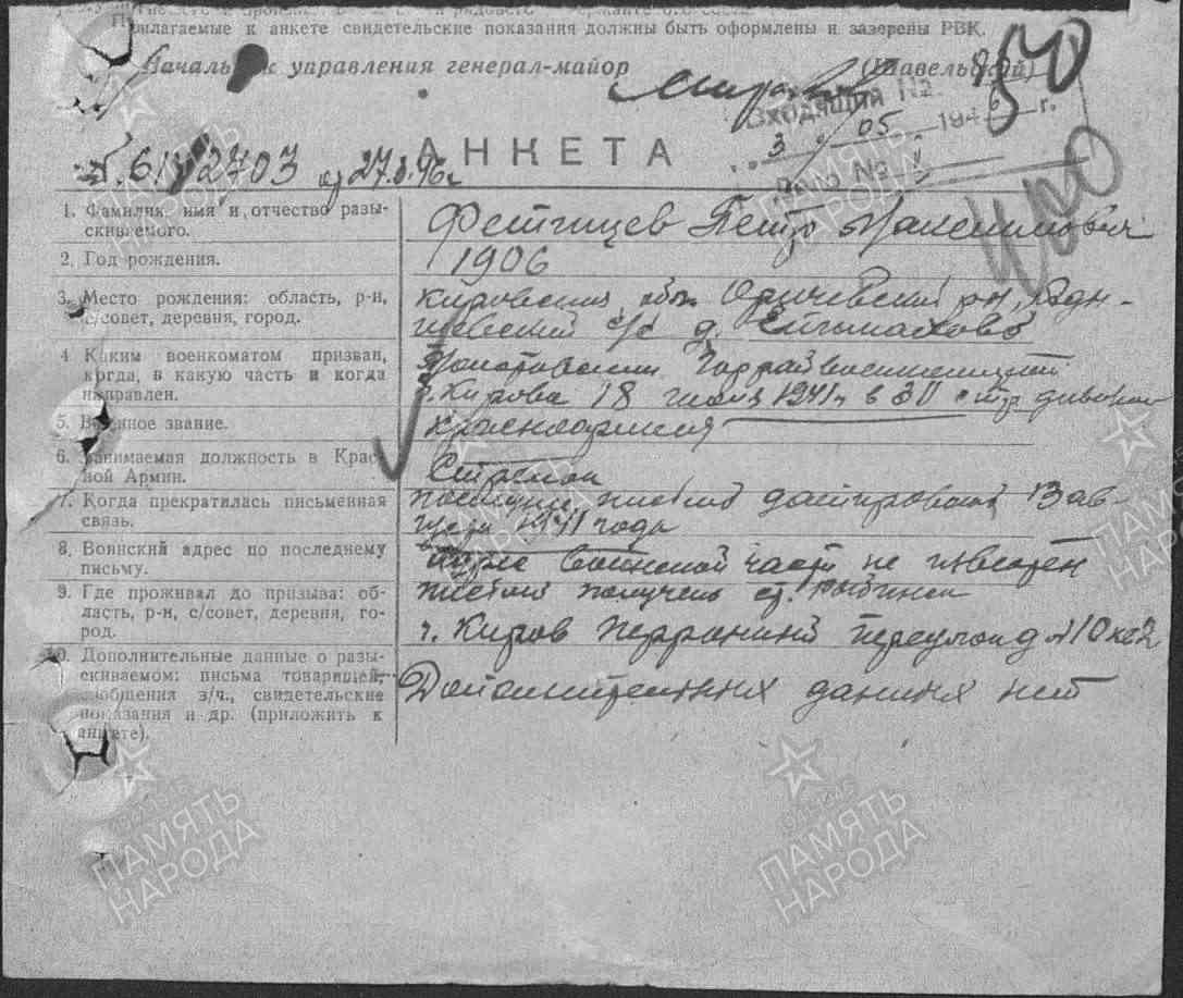Фетищев Пётр Максимович, 1906 г.р., уроженец д. Епимахово Адышевской волости Орловского уезда (в настоящее время Оричевский район). Перед мобилизацией проживал в г. Кирове. Мобилизован Молотовским ГВК г. Кирова 15.07.1941 г. Красноармеец, рядовой, 3 роты 1 батальона 1067 сп 311 сд (принял присягу 24.07.1941 г. в г. Кирове, есть в раздаточной ведомости денежного содержания за июль 1941 г.). Мобилизован в 311 сд, письма были со ст. Бабино и из г. Рыбинска в августе 1941 г. Считается пропавшим без вести в августе 1941 г.