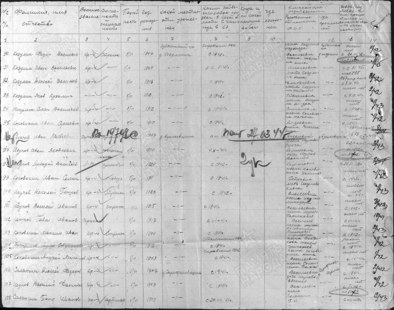 Козулин Алексей Васильевич, 1916 г.р, из д. Козулины Лубягинского с/с Кирово-Чепецкого района. Мобилизован Кировским РВК 18.07.1941 г. Красноармеец, рядовой, 3 роты 1 батальона 1067 сп 311 сд (есть в раздаточной ведомости денежного содержания за июль 1941 г.). Последнее письмо от 08.09.1941 г. (ППС 955, 1067 сп). Считается пропавшим без вести в марте 1942 г.