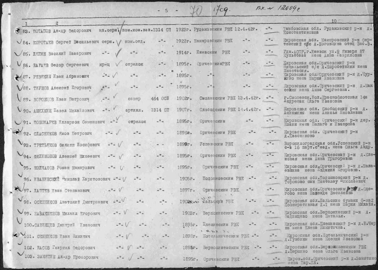 | 4308423008 | РЕВЯКИН Иван Абрамович | 1895 г. р., д. Чуркины Чуркинского с/с, красноармеец, стрелок, в-ч 71 Зсп, г. Киров, в мае 1942 г. пропал без вести. | Кировская область, Оричевский район |
