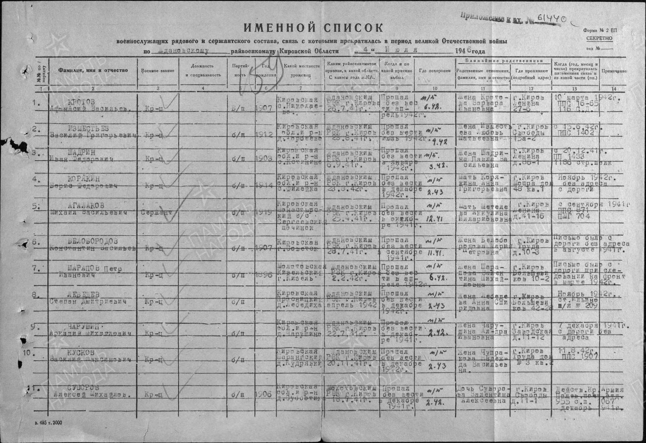 | 4315676009 | СУВОРОВ Алексей Михайлович | 1906 г. р., д. Субботиха Макарьевского с/с Кировского р-на, кр-ц, стрелок 955 сп, мобилизован Молотовским РВК. Пропал без вести в феврале 1942 г. | Кировская область, Киров |