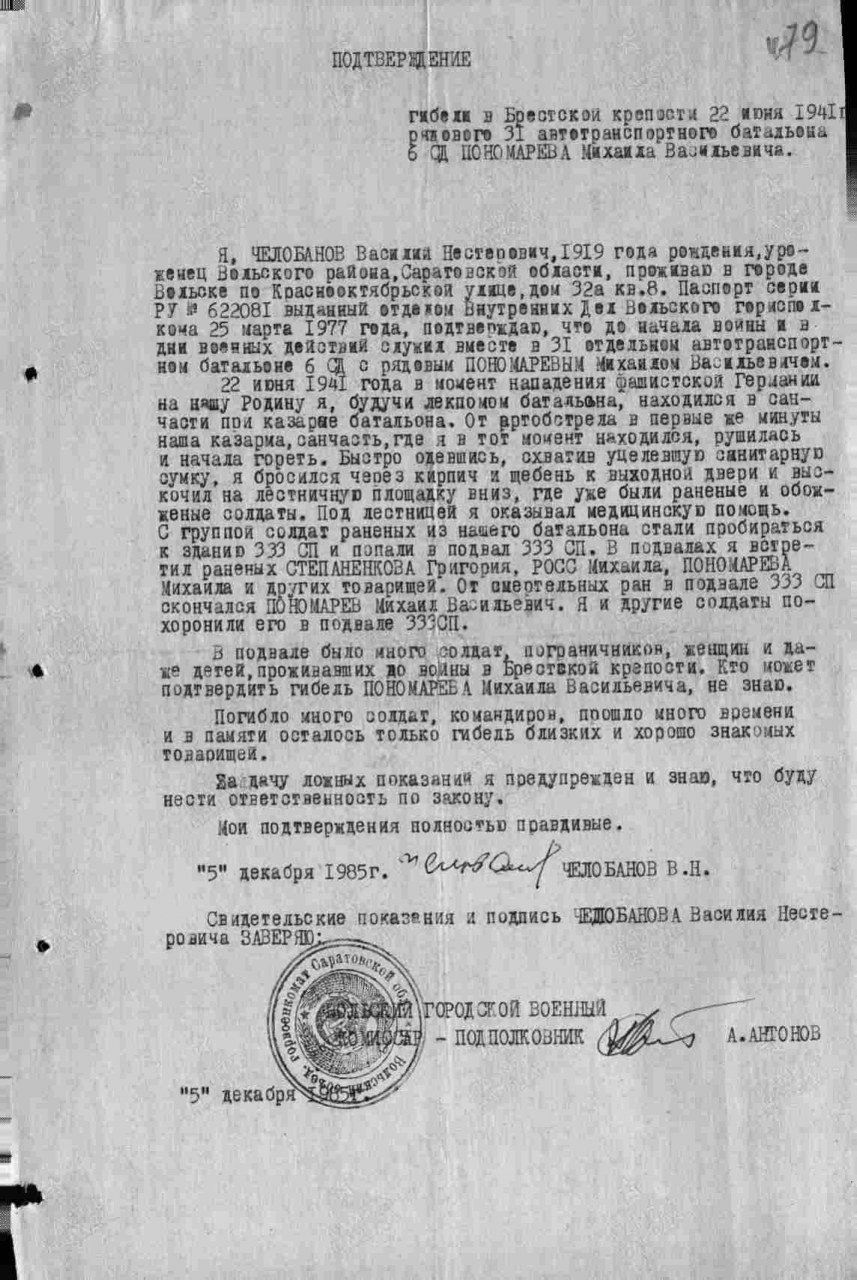 | 4310541023 | ПОНОМАРЕВ Михаил Васильевич | 1920 г. р., проживал в п. Первомайском. Призван Слободским РВК в октябре 1940 г. Красноармеец 31 отд. автобат-на. Погиб 30.06.1941 г. Захоронен в Брестской крепости. | Кировская область, Слободской район | |||