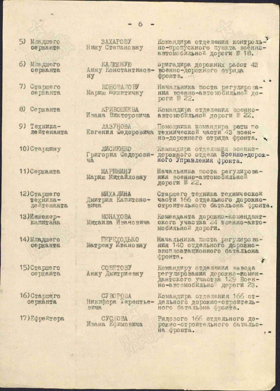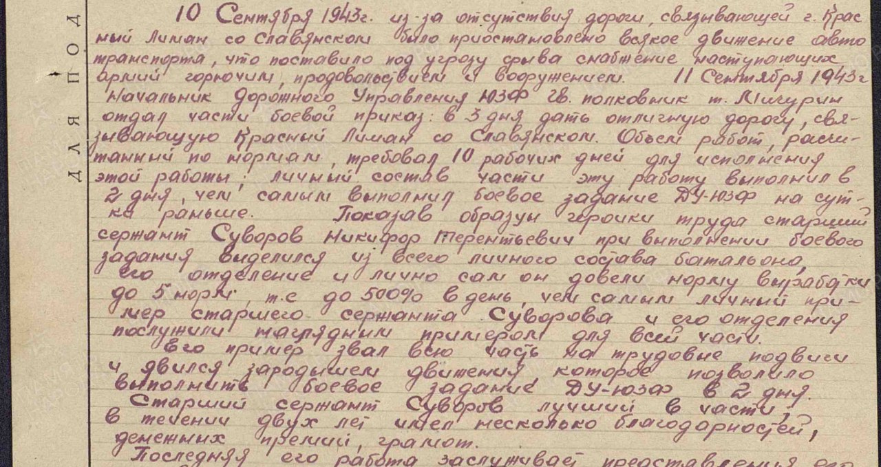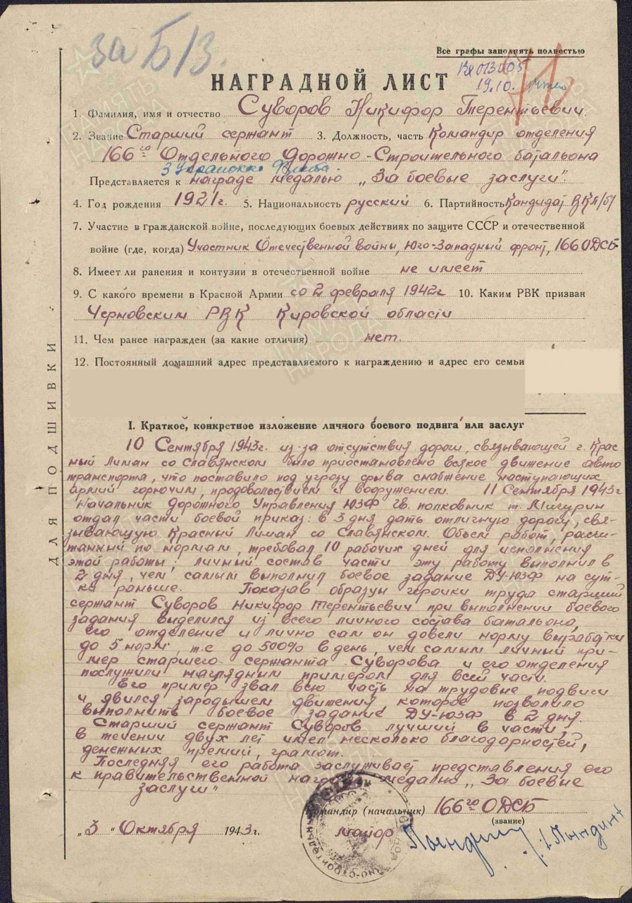 | Награждён: Медаль «За боевые заслуги» | 26.10.1943 | Наградной документ Дата рождения: __.__.1921 Наименование военкомата: Черновский РВК, Кировская обл., Черновский р-н Дата и место призыва: Черновский РВК, Кировская обл., Черновский р-н Дата поступления на службу: 02.02.1942 Воинское звание: ст. сержант Воинская часть: 166 одсб Кто наградил: ВС 3 Украинского фронта Наименование награды: Медаль «За боевые заслуги» Номер документа: 1332 Дата документа: 26.10.1943 Место призыва: Черновский РВК, Кировская обл., Черновский р-н Приказ подразделения №: 1332 от: 26.10.1943 Издан: ВС 3 Украинского фронта Информация об архиве - Архив: ЦАМО Фонд ист. информации: 33 Опись ист. информации: 682526 Дело ист. информации: 1769 Информация об архиве - Архив: ЦАМО Картотека: Картотека награждений Расположение документа: шкаф 83, ящик 23 | |