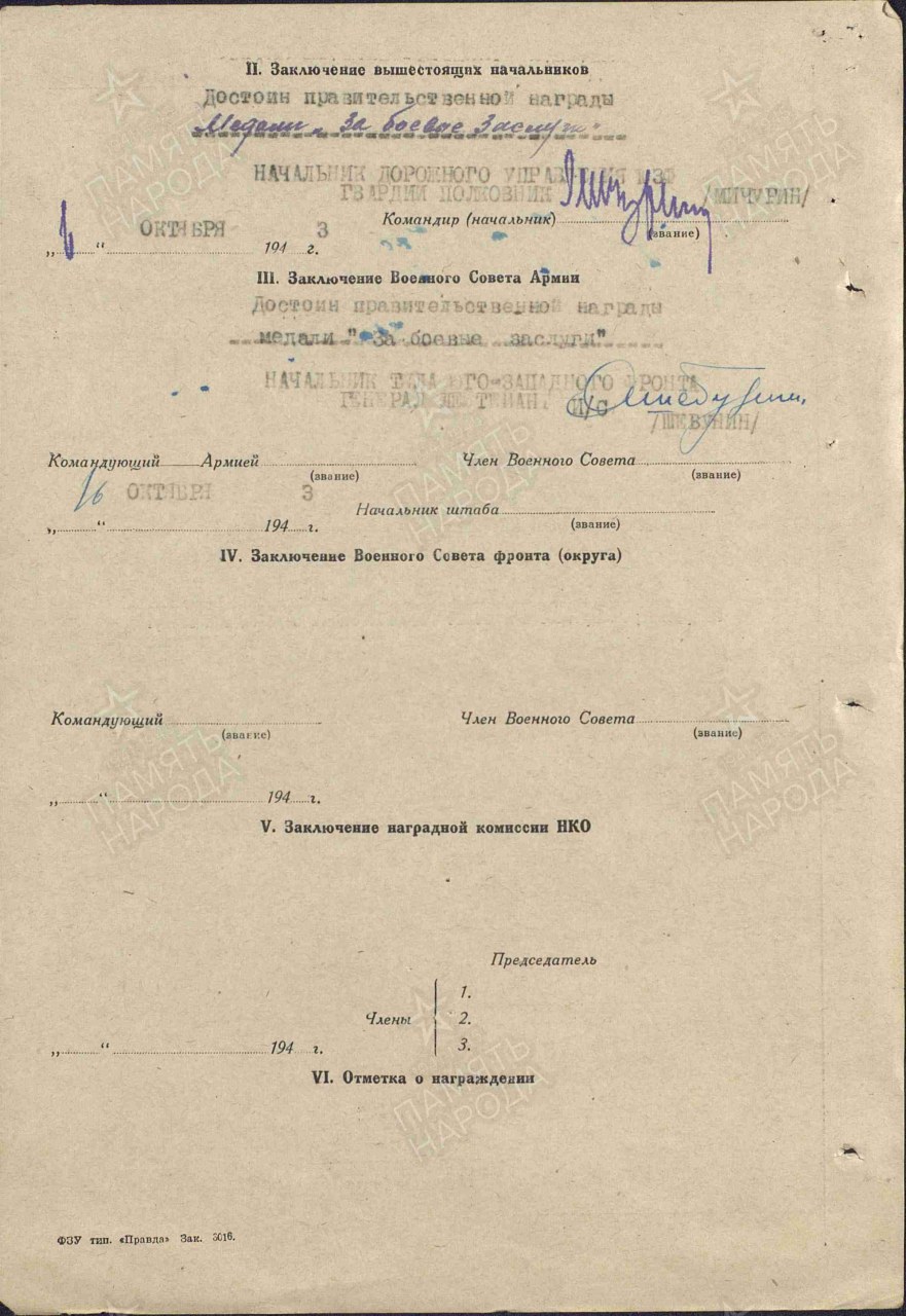 | Награждён: Медаль «За оборону Советского Заполярья» | 17.06.1945 | Акт От: 17.06.1945 Издан: 166 одсб Архив: ЦАМО Фонд: 33 Опись: 44677 Единица хранения: 465 № записи 1531386915 | |