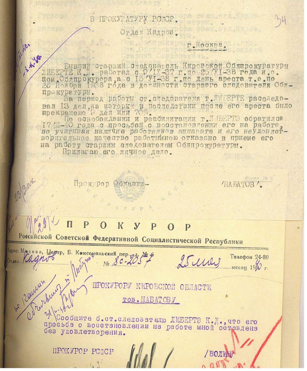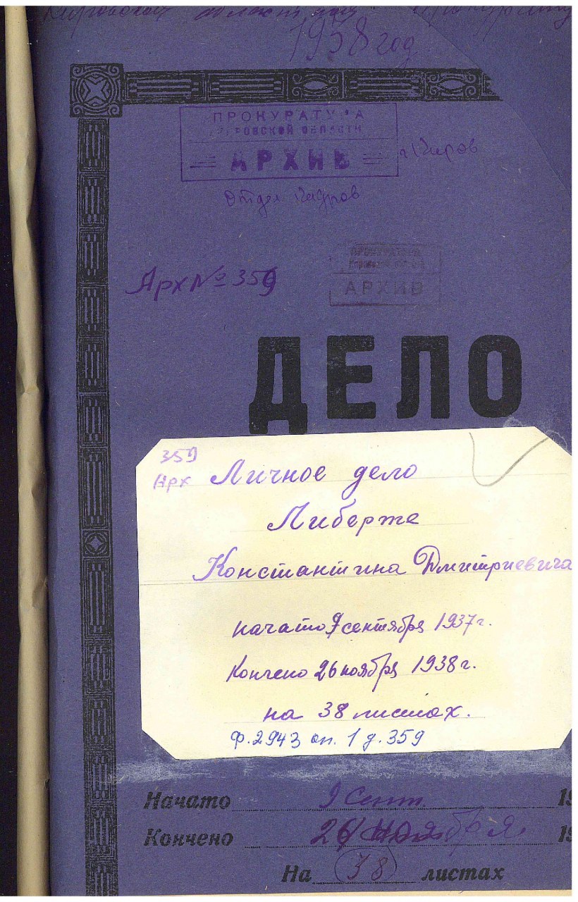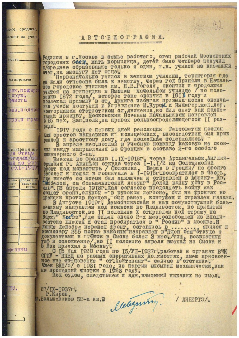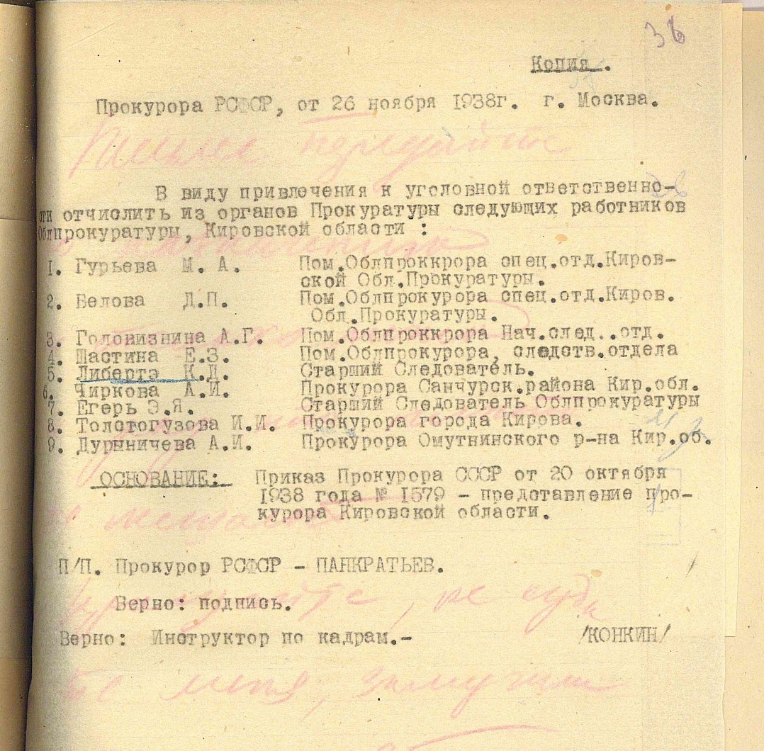 | 1925339 | Либертэ Константин Дмитриевич | Род. 1899, г. Кирова Национальность: русский Проживание: г. Кирова Занятие: ст. следователь областной прокуратуры. | Арест: 25.09.1938 Обвинение: обвинялся по ст. 58 пп. 6, 10 УК РСФСР Осуждение: 23.12.1939, военный прокурор ГВП Приговор: дело производством прекращено за недоказанностью обвинения, из-под стражи освобожден. | — | Книга Памяти Кировской обл. (тт. 1-4) |