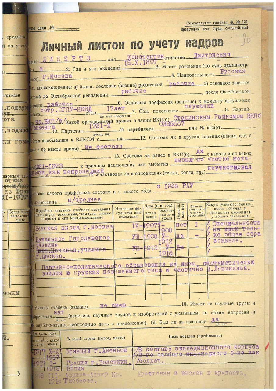 | Родился ребёнок: Либертэ Георгий Константинович | 02.04.1923 | г. Туркуль, Кара-Калпакская АССР | Участник ВОв. Призван Молотовским РВК. Л-нт, ком. пул. взвода 370 отд. пад, 119 УР. Погиб в бою 24.02.1944 г. Захоронен в Могилевской обл. 2 км вост. п. Боевой, в лесу. |