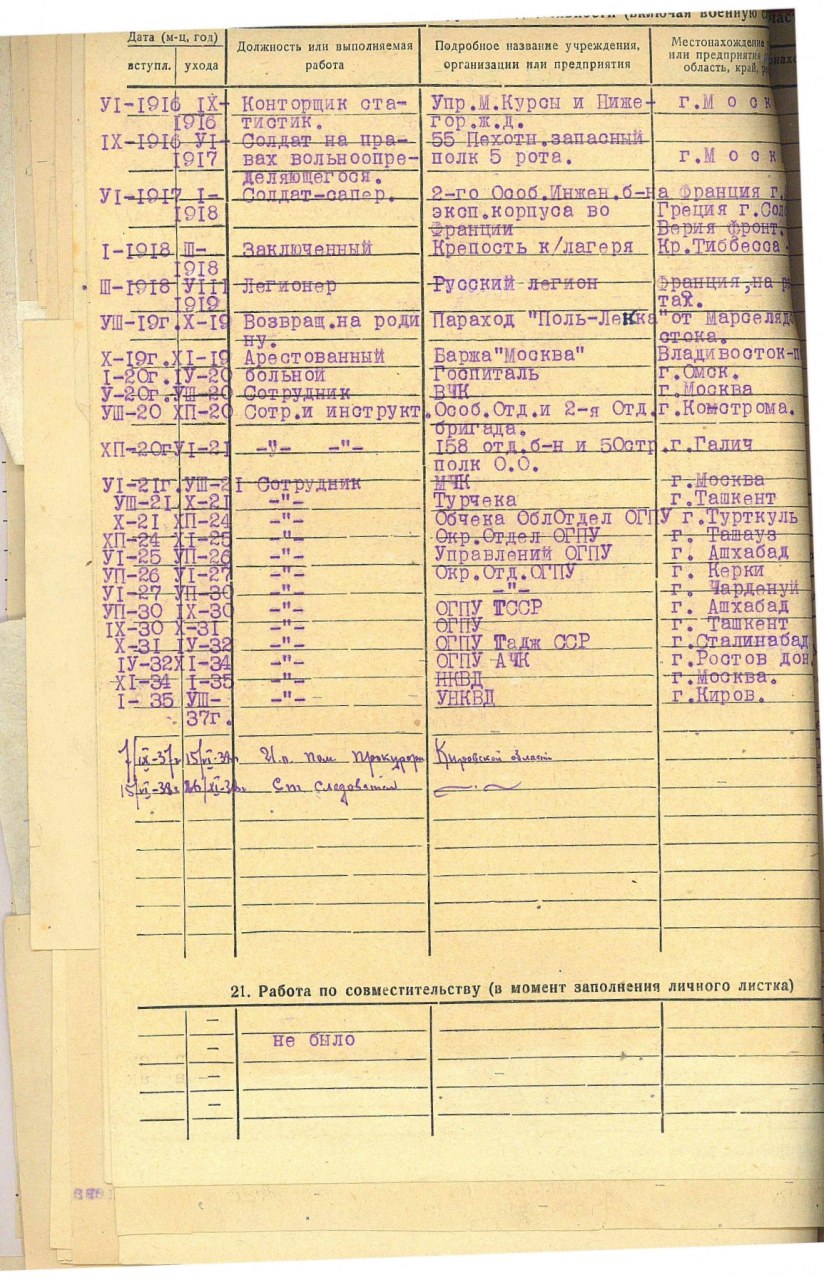 | И.о. помощника прокурора Кировской области | 01.09.1937 - 15.06.1938 | город Киров (Вятка, Хлынов) (Город Киров, Кировская область) - существующий н.п. | |