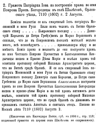 Храмозданная грамота всероссийского патриарха Иова (первое документальное упоминание о селе Шалегово)