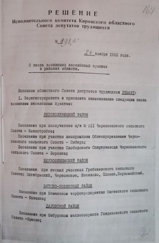Копия Решения Исполнительного комитета Кировского областного Совета депутатов трудящихся № 898 "А" от 24.11.1955 г. "О вновь возникших населённых пунктах в районах области". Прошнуровано и скреплено печатью три листа. Лист 1.