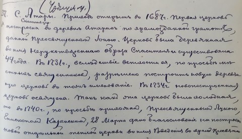 Настольная книга о церквях и духовенстве Вятской епархии, рукопись, 1909 г. с. Атары №637 (ЦГАКО 1404-1-5)