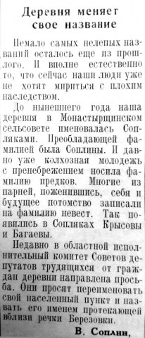 газета "Коллективное животноводство" 1959 год . Просьба жителей деревни Сопляки Монастырщинского сельсовета о переименовании населенного пункта в Березовку по имени речки, которая здесь протекала. Но в итоге деревню назвали Морозовка. Самое интересное то, что здесь была школа, которая носила название Коржавинская.