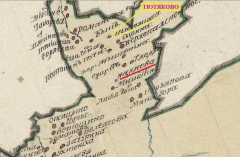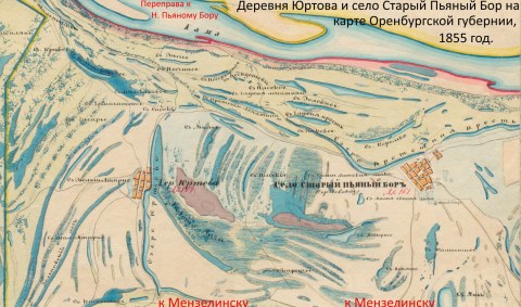 Фрагмент карты Оренбургской губернии, 1855 год, окрестности села Ст. Пьяный Бор.