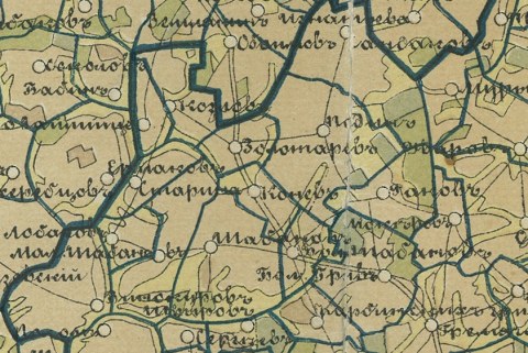 Участок карты Котельнического уезда 1893 года, где отмечены два населённых пункта: Золотарев и Конев
