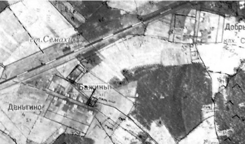 Фрагмент аэрофотосъемки 1936 г. Отмечены дер. Деньгино (южная часть), Бажины (северная часть)