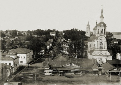 Вид на город с колокольни Благовещенской церкви (правее Спасской церкви). На горизонте церковь Рождества Пресвятой Богородицы