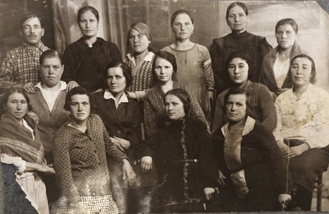 1933 г. Третья слева в нижнем ряду - Ямашева Зоя Михайловна 1915 г.р. Надпись на обороте: "Экскурсия колхозниц-ударниц Вятскополянского района в Сталинград. 16.IX.33"