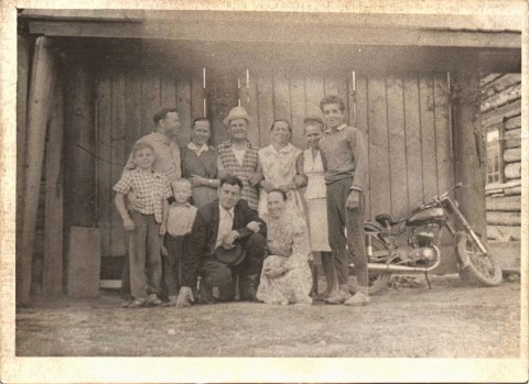 Фото 1964г. Присутствуют - Михаил Иванович Гущин в первом ряду второй слева, рядом с ним мальчик постарше - Сергей Григорьевич Гребнев, над ними - Анна Александровна Гущина (Гребнева), Григорий Петрович Гребнев, ее брат двоюродный. в верхнем ряду, четвертая слева - Ольга Прокопьевна, сестра деда Ивана Прокопьевича, родилась в дер.Митрошонки, 24.06.1916