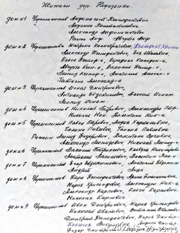 Приложение к схеме д. Нефеденки. Список домов и жителей по состоянию на 1965 год. Автор Черемисинов Николай Иванович. Предоставила Светлана Пестова.