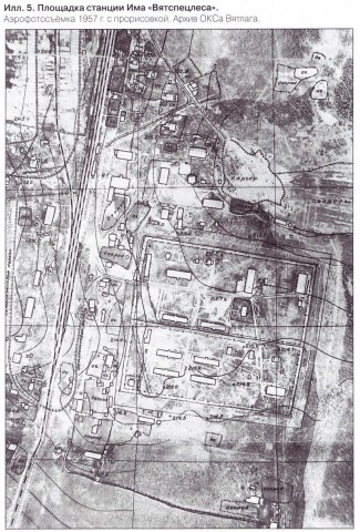 Площадка станции Има "Вятспецлеса". Аэрофотосъемка 1957 г. с прорисовкой. Архив ОКСа Вятлага. Из книги "Памятники архитектуры и градостроительства...", выпуск 4.