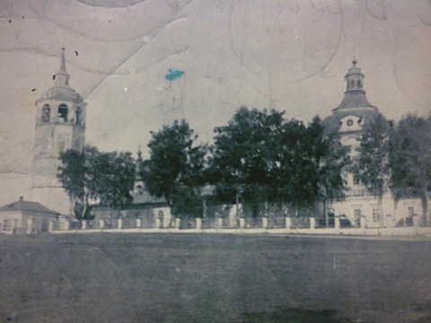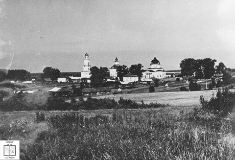Общий вид храмового комплекса (Преображенскую и Никольскую церкви) с. Великорецкого Юрьянского района Кировской области. 1970 г.
